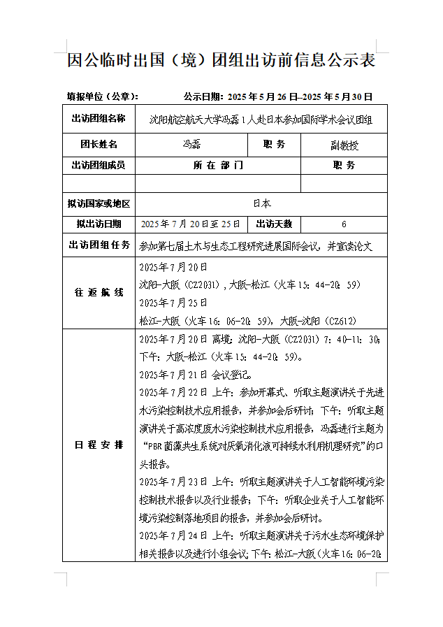 应第七届土木与生态工程研究进展国际会议的邀请,必赢官网拟派冯磊同志于2025年7月20日至7月25日赴日本参加第七届土木与生态工程研究进展国际会议。现就此计划予以公示。公示日期:2024年5月26日-5月30日。如有异议,可在公示期内与必赢线路检测3003联系,电话:024-89724878,邮箱:foreignaffairs@sau.edu.cn。