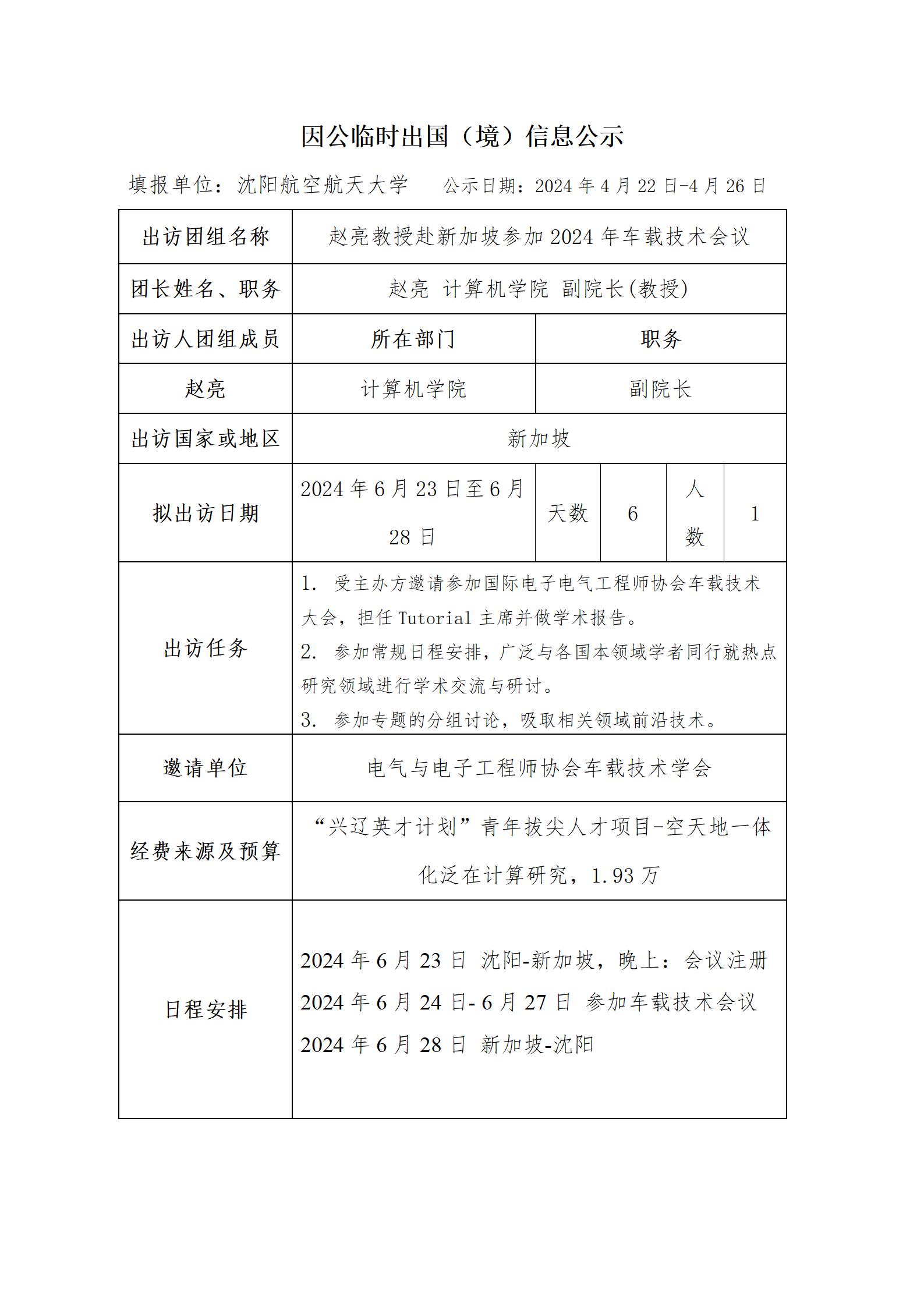 应电气与电子工程师协会车载技术学会的邀请,必赢官网拟组派赵亮同志于2024年6月23日至6月28日赴新加坡参加2024年车载技术会议。按照省外办有关最新管理规定,现就此计划予以公示。公示日期:2024年4月22日-4月26日。如有异议,可在公示期内与外事处联系,电话:024-89724878,邮箱: foreignaffairs@sau.edu.cn 。